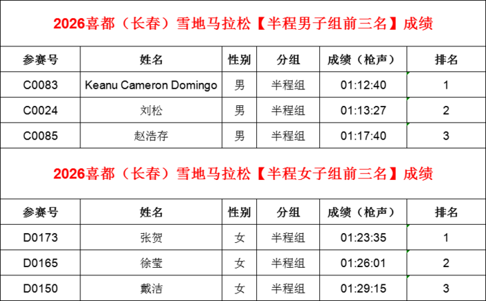 2026长春(喜都)雪地马拉松暨第九届长春冰雪马拉松半程组男女冠亚季军公示!