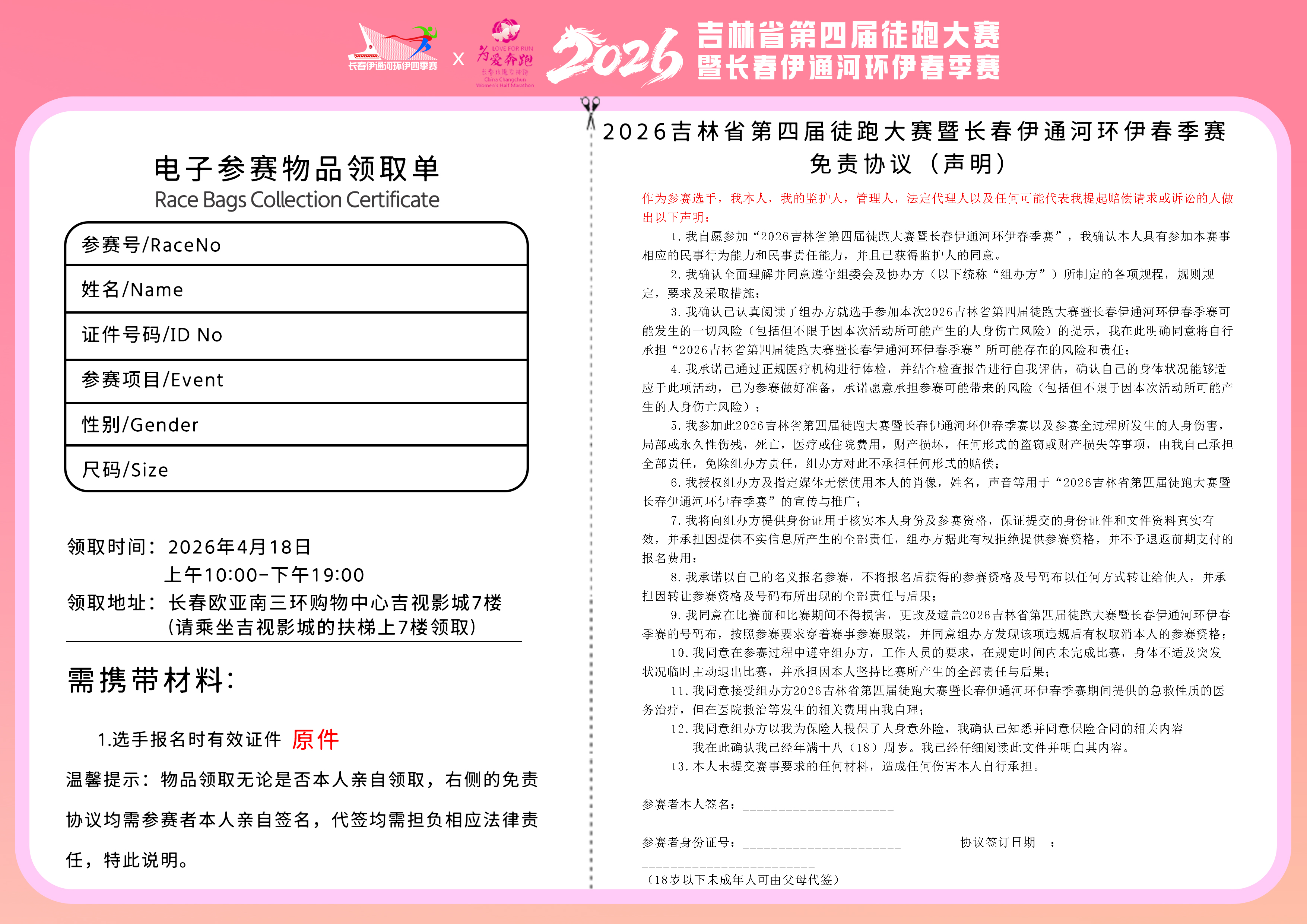 输入姓名及身份证号查询个人参赛号,并可下载物料领取单!