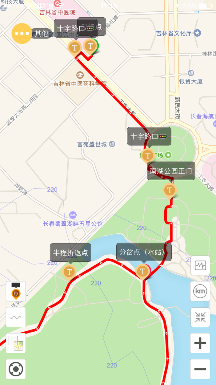 从起点(中信银行红旗街支行)出发,沿规定路线至南湖公园内分岔点,环湖十圈后至全程折返点后沿路线返回终点。