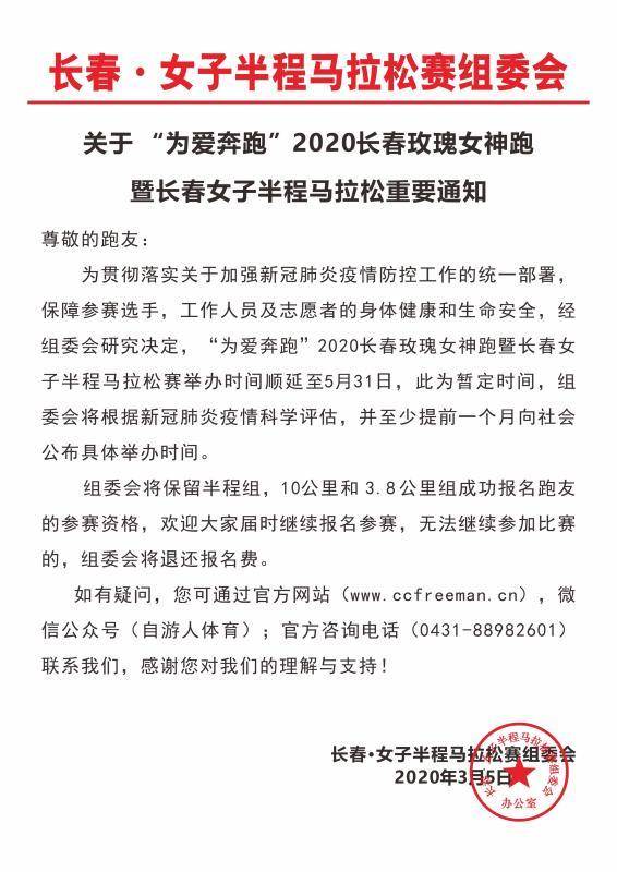 原定于2020年4月12日举行的长春玫瑰女神跑暨长春女子半程马拉松延期到2020年5月31日举行,欢迎小伙伴继续报名参赛,如有特殊情况无法参赛处理办法如下: