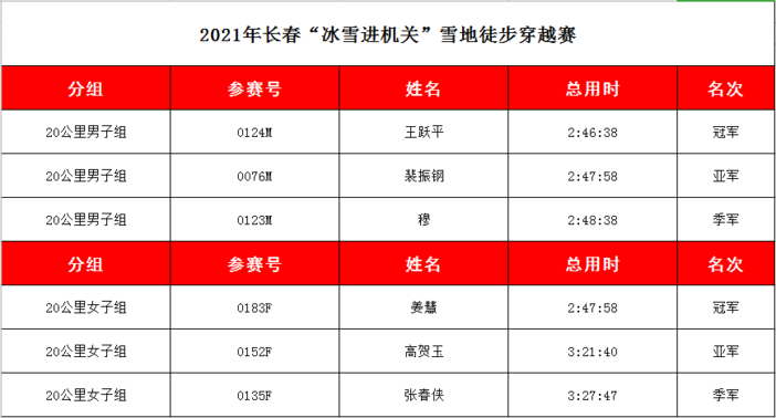 经过激烈角逐,20公里男女第一名分别被:王跃平以2小时46分38秒与姜慧以2小时47分58秒获得!