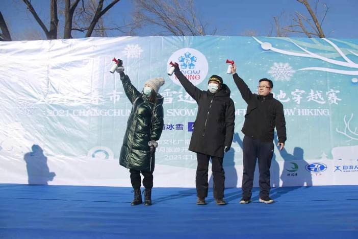 现场参赛选手、工作人员、观众共同欢呼“2021祖国你好”,齐声高唱国歌,现场气氛隆重热烈。长春市文化广播电视和旅游局一级调研员曹广彬、净月区文化旅游和体育局副局长毛启超、长春净月潭旅游发展集团副总经理孙雪岩共同为赛事鸣枪发令。