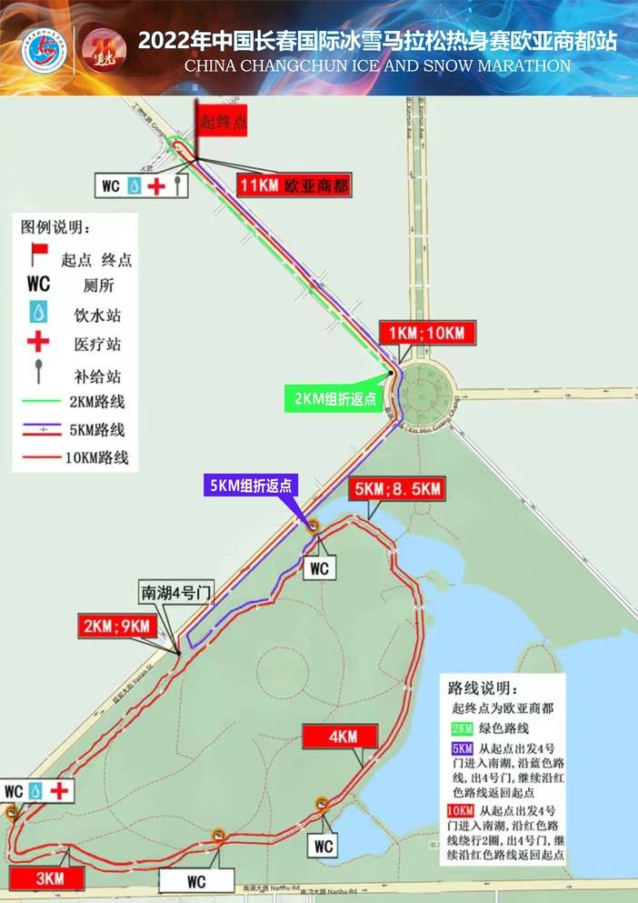 5公里组别:从起点出发,沿蓝色的路线进入南湖4号门,然后沿蓝色路线折返,继续沿红色路线返回起点;