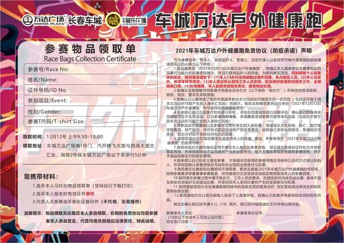 需要特别注意:物料领取单的右侧为免责协议,请自行签署好自己的名字及身份证号码与签署日期(日期为活动当天的日期),未满18岁儿童需要将名字和监护人(父母)签署在一起即可;