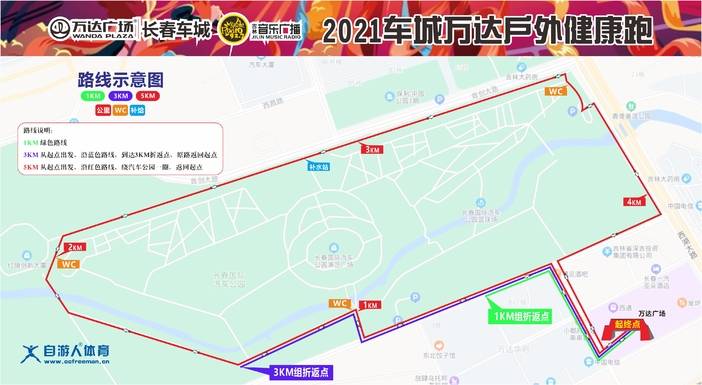 5KM 从起点出发,沿红色路线,绕汽车公园一圈,返回起点。