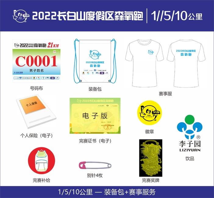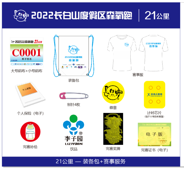 | 项目 | 号码布 | 小号码布 | 芯片 | 祝福牌 | 赛事T恤 | 别针 | 饮品 | 装备包 | 徽章 | 奖牌 | 保险 |