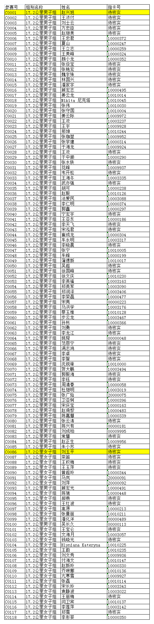 个人参赛号及手环编号(指卡号)请浏览以下信息;如果有出入请与组委会联系:0431-88982601;18686613065