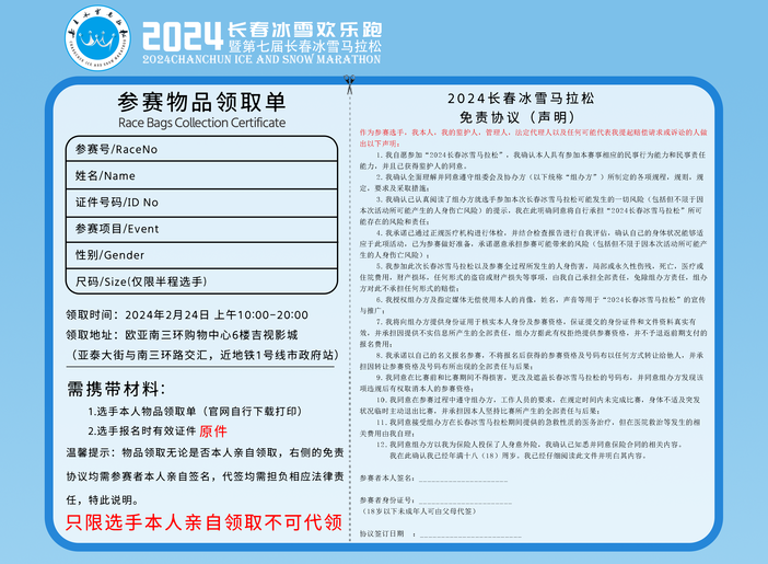 (1)2月24日申领参赛包:半马与10公里选手领取完参赛包后,请勿折叠您的号码布,本次比赛用的是一次性芯片,芯片就在号码布背面的胶条内,请勿撕毁; (2)申领参赛包请携带身份证原件,仅限本人领取,不接受代领;
