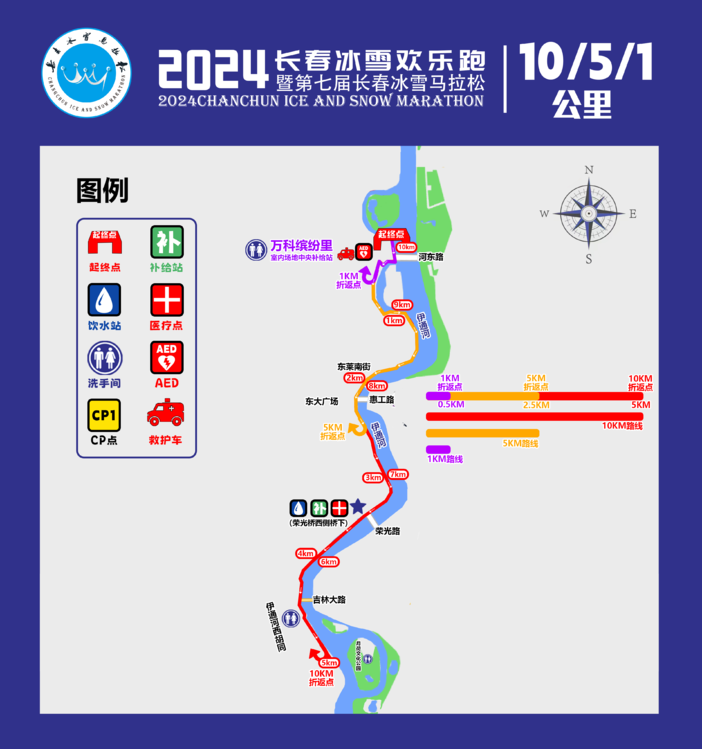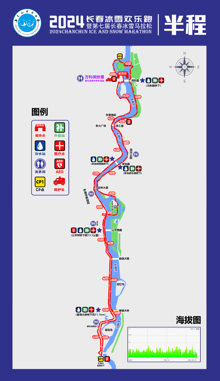 | 补给站 | 荣光桥西侧桥下3.3KM | 公平桥桥下5.8KM | 赛德大桥桥下8KM | 赛德大桥桥下11.1KM | 公平桥桥下13.5KM | 荣光桥东侧桥下16.2KM | 河东路东侧桥下19.5KM | 主补给站(缤纷里) |
