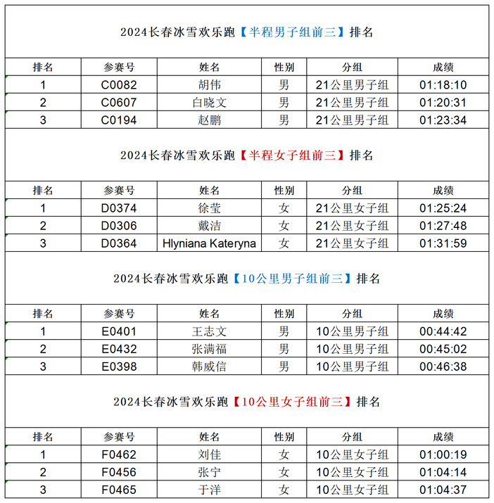2024长春冰雪欢乐跑半程组及10公里组冠亚季军排名公示!