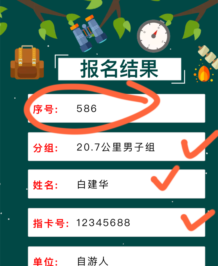 向工作人员所要自己组别的二维码图片,然后用手机扫码进行信息填写,请勿写错信息,如果发现信息录入错误需要跟工作人员说明,待更改后再次扫码填写信息;需要填写的信息包括:个人“真实姓名”,“手环号码”(8位数字)(手环号码在自己的手环上,用钢印打出的8位数字,如果是老手环, 不足8位数字,请向工作人员询问)“手机号码”,单位信息可以不填写;