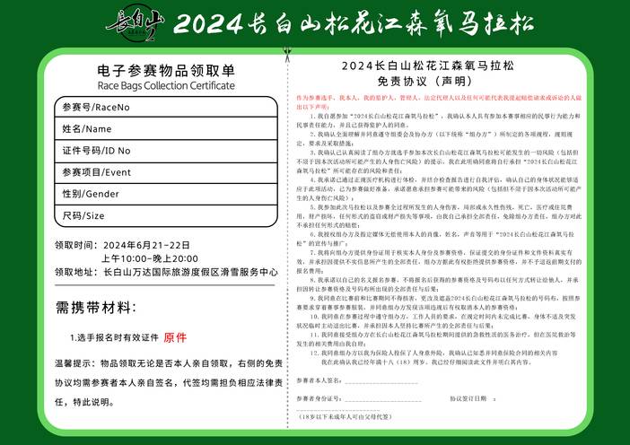 (2)6月21-22日申领参赛包:半程选手领取完参赛包后,请勿折叠您的号码布,本次比赛用的是一次性芯片,芯片就在号码布背面的胶条内,请勿撕毁;