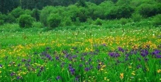 整片草甸被密林环绕,花朵像蝴蝶展翅,在林间成片地铺将开去,景色十分动人。