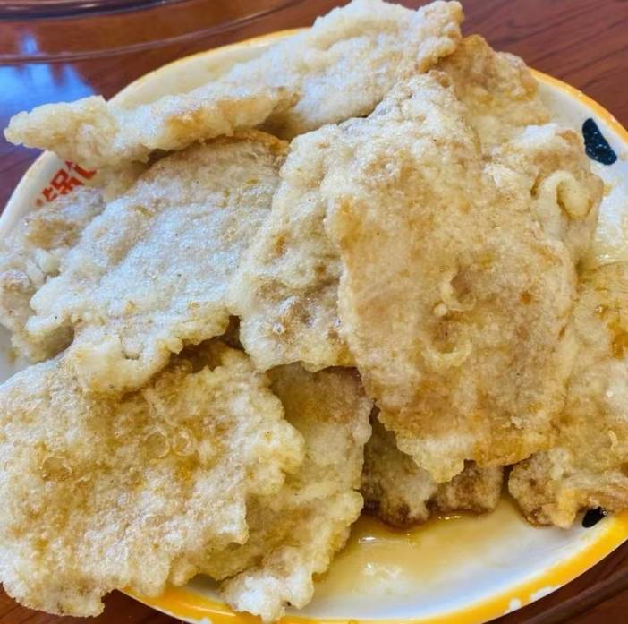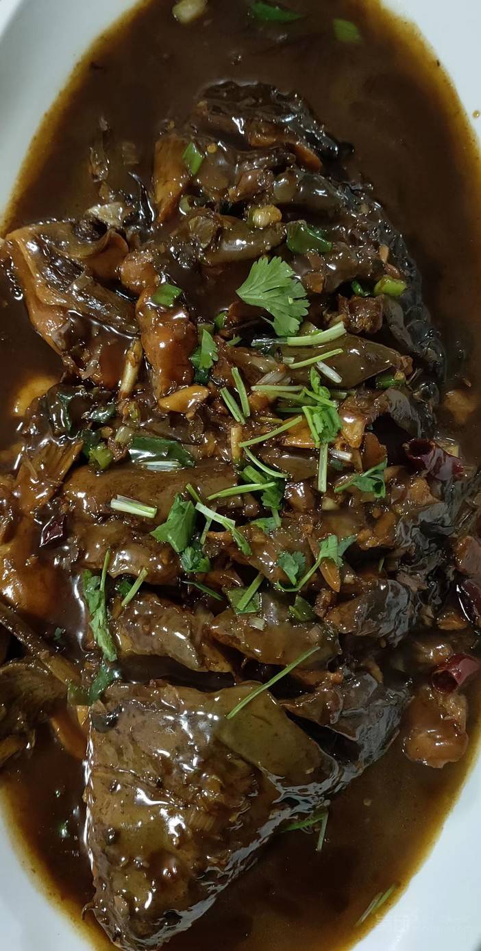 锅包肉:点缀着香菜、葱花、胡萝卜、姜丝,大肉片挤挤挨挨的摆在金黄剔透的汤汁里,一口咬下去,外表酥脆、肉质鲜美,一起融在口里,那叫一个满足。