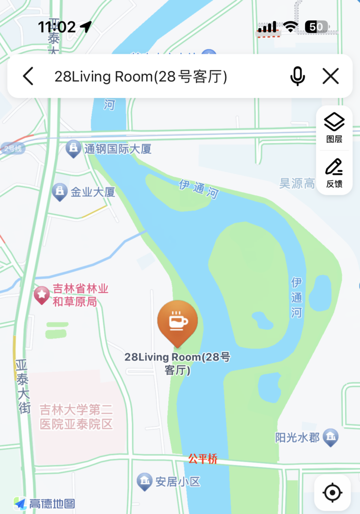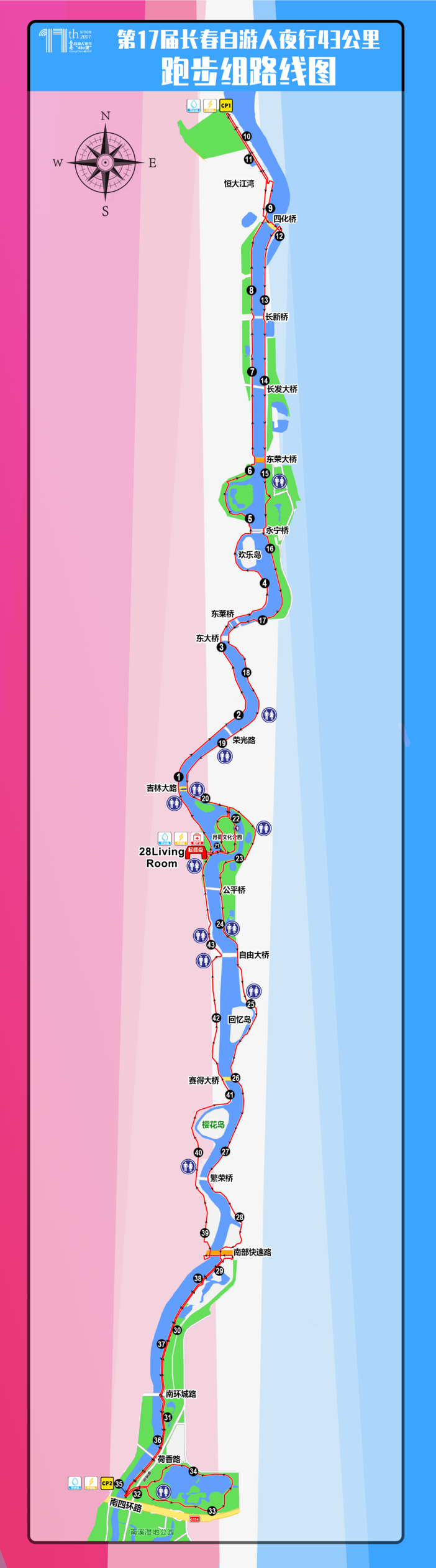 所有路线均在公共道路上完成,请注意道路安全,责任自负,服务方为参与人员购买人身意外伤害险,43公里组保险日期为10-11日两天,除全程组外其余组别保险到期日为10日晚24点前有效;活动中出现任何意外事故责任均自负,参与活动均认同此约定,谢谢!祝您参赛愉快!【起点/终点】 伊通河 28 Living Room (28号客厅)(高德导航:28 Living Room)(自驾人员可以把车辆停放在“公平桥”两侧停车位或停车场)