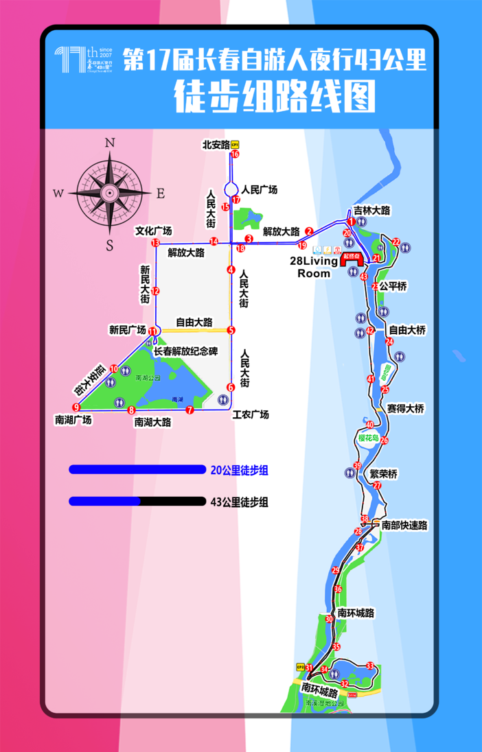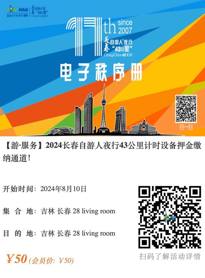 【比赛说明】本次活动为自发组织的活动,自游人俱乐部仅为服务单位,在活动过程中发生的任何意外事故均与服务单位无关,与相互参与者亦无关,均由参与者本人自行承担相应责任,参与此活动即认同此条款,并已明晰本次活动中存在的风险,责任自负!(1)本次活动起点与终点均为伊通河 28 living room 咖啡店,均为室外空间,我们可以为参赛选手提供更多的服务,诸如物品寄存,返回后的休息空间,手机充电服务,赛后补给等,欢迎选手广为利用;“两步路户外助手”APP的轨迹图,大家可以下载后作为导航参考使用;(页面最上方已经发布了相关轨迹,可以扫码进行下载)(2)本次活动半程及全程终点处补给站为大家提供饮用水等常规补给,饮用水现场不提供纸杯,如需补给请自备水壶或水袋;(3)20公里半程及以上组别我们强烈建议个人准备水壶(或水袋);头灯或手电(手机不可代替头灯或手电);如强制装备不全,将劝退本次活动,感谢您的配合;其余路段补给需要自理;(4)新人参加活动一定要注意活动的节奏,并建议穿用旧鞋子,保持舒适跟脚,以免时间较长,至使脚部受损;(5)活动过程中,所有路线均在公共道路进行,请大家遵守公共安全,走人行横道,及步道,注意人身安全及个人财务安全,尽量结伴而行;(6)本次活动已经强制为大家购买保险,活动过程中所发生的任何意外及经济损失均与组织者无关,属于保险范围内的将由所投保的保险公司负责赔偿事宜,活动前参与人员必须签署活动免责协议!(7)本次活动为非竞技性活动,提倡大众健身,建议参加者根据自身体力量力而行,自备饮用水与高热量食品,一但发现任何身体不适,请停止以上活动,尽快就医;(8)活动一但遇到突发情况,请尽快拨打救援电话:火警:119,匪警:110;急救:120;工作人员电话:13194308505;13166898041,13039006667(9)如遇当天活动下雨,请自备雨具!(10)关于组别更换说明: 如因个人原因,现场需要进行组别更换,只能遵循从高至低更换原则,例如:全程组可更换半程组或体验组,但不允许体验组更换半程组或全程组。更换组别仅在签到处或CP点进行登记备注,胸牌及参赛号不变。本次活动购买保险者,在活动中发生任何意外事故,由保险公司受理,组织者均不承担任何刑事与经济赔偿责任,但组织者有积极配合救援的义务;