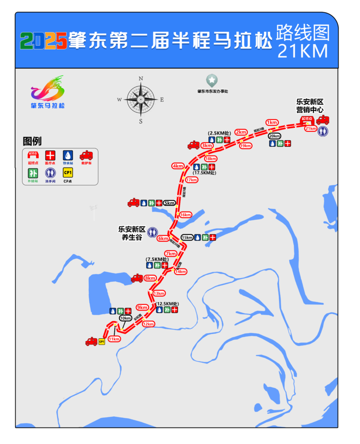 | 补给站 | 2.5KM | 5KM | 7.5KM | 10KM | 12.5KM | 15KM | 17.5KM | 20KM | 终点 |