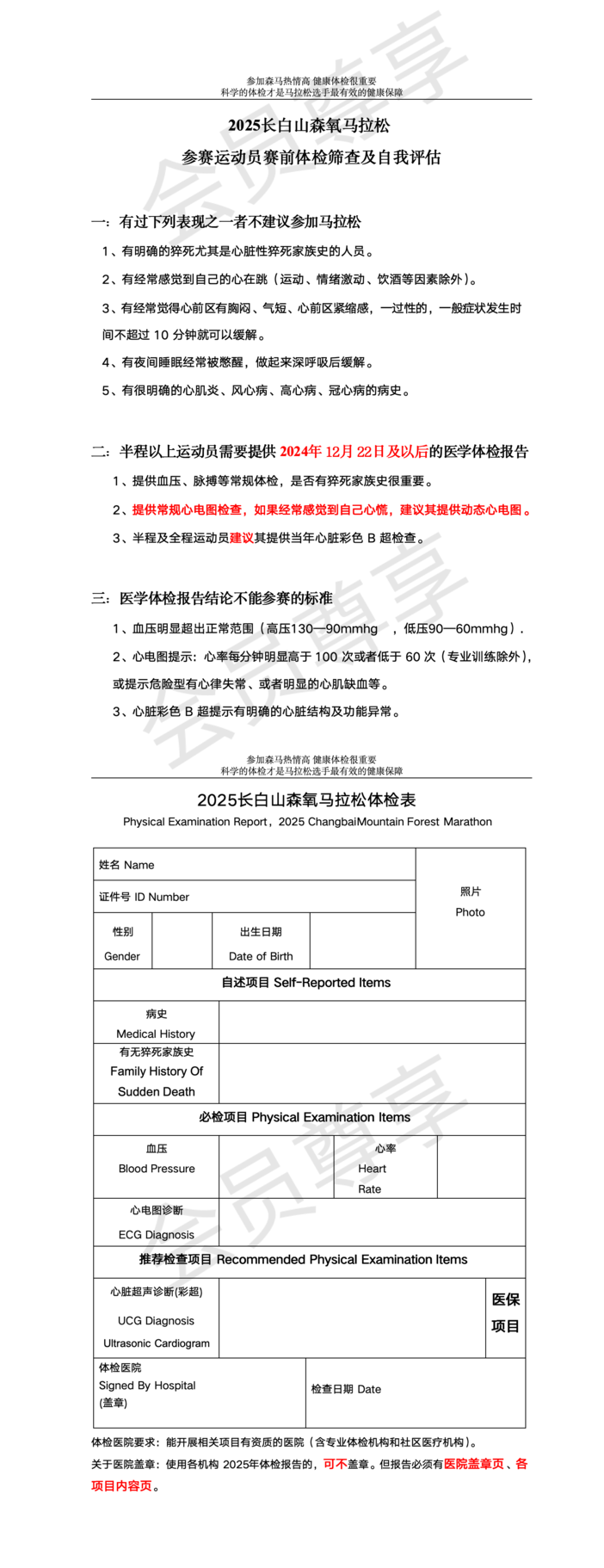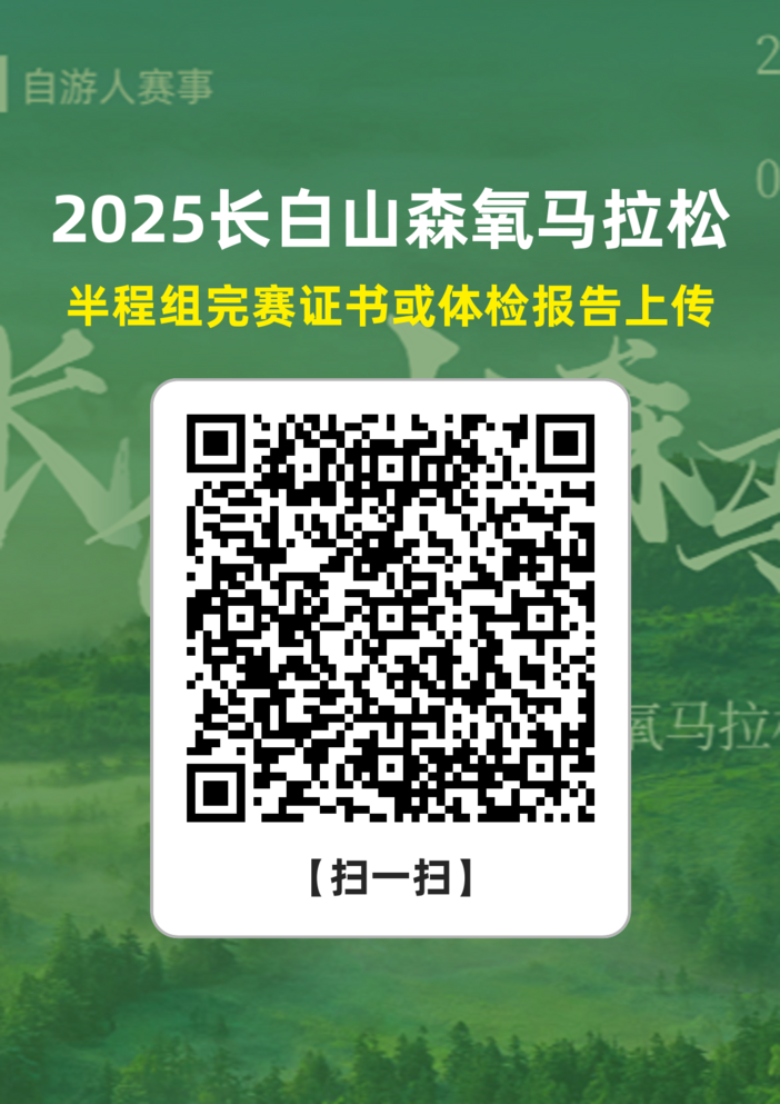 尊敬的2025长白山森氧马拉松半程参赛选手,为了您能够安全完赛,赛前对自己的健康状况有一个良好的评估,我们在报名的赛事信息中已经明确所有参与半程比赛的选手需要提供近1年的半程马拉松完赛证书或近6个月的体检报告,现就以上信息收集工作做如下说明,请认真完成,谢谢!1)所有文件上传通道请扫一扫,在2025年6月15日之前完成上传,半程以外选手不需要进行以上操作!