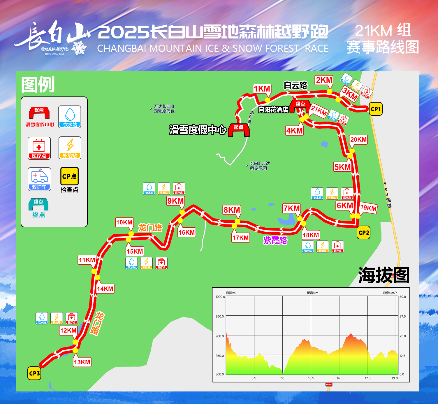 | 补给站 | 3KM | 6KM | 9KM | 12KM | 15KM | 18KM | 21KM | 完赛补给(北岸餐厅) |